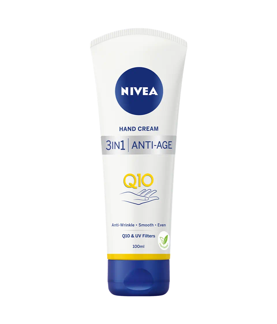 Przeciwzmarszczkowy krem do rąk NIVEA 3w1 Anti-Age Care to wyjątkowa, pielęgnująca formuła z kompleksem Q10 i filtrami UV. Krem do rąk nawilża skórę rąk oraz pomaga redukować widoczność zmarszczek na dłoniach. Dodatkowo wygładza i wyrównuje teksturę skóry, zapobiegając powstawaniu przebarwień słonecznych, dzięki zawartości ochronnych filtrów UV. Formuła jest wegańska*, a jej przeciwzmarszczkową skuteczność udowodniono w badaniach. Zapewnij 24-godzinną ochronę i nawilżenie dla normalnej i suchej skóry dłoni z przeciwzmarszczkowym kremem do rąk NIVEA!