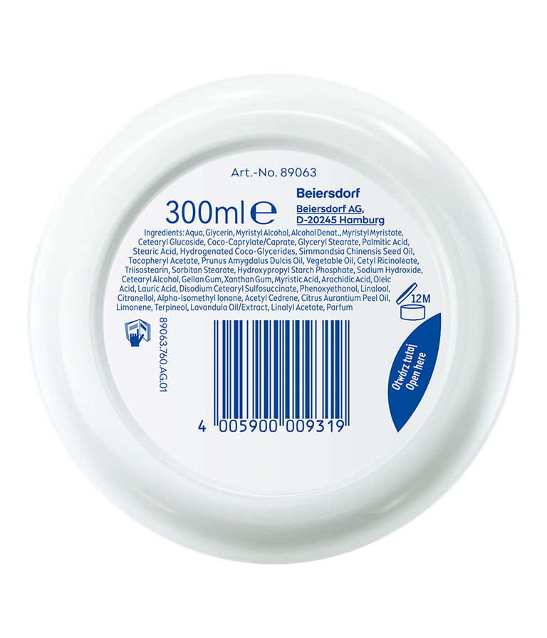 Aqua, Glycerin, Paraffinum Liquidum, Myristyl Alcohol, Butylene Glycol, Alcohol Denat, Myristyl Myristate, Palmitic Acid, Glyceryl Stearate, Stearic Acid, Cera Microcristallina, Hydrogenated Coco-Glycerides, Simmondsia Chinensis Seed Oil, Tocopheryl Acetate, Lanolin Alcohol (Eucerit®), Myristic Acid, Arachidic Acid, Oleic Acid, Polyglyceryl-2 Caprate, Dimethicone, Carbomer, Sodium Hydroxide, Phenoxyethanol, Linalool, Citronellol, Alpha-Isomethyl Ionone, Benzyl Alcohol, Limonene, Benzyl Salicylate, Parfum.